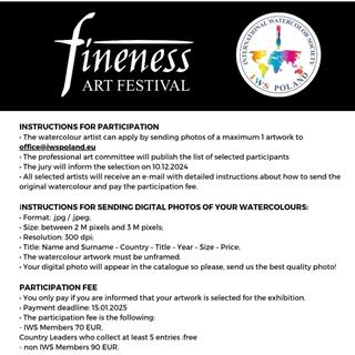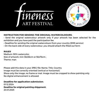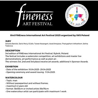 Date Published: 2024-10-31 fineness art festival Sending the original watercolor painting is only possible if the work is selected for the exhibition and payment is made. JURY Antonio Bartolo, Dario Percy CCallo, Tawee Kesangam, Aood Ampawa, Thanyaphorn Inthanhom, Selma Todorova DESCRIPTION 3rd edition of FINEness International Art Festival, Rybnik, Poland. The festival includes a watercolor competition, art exhibitions and master live demonstrations, art performance as well as plain air . The winners (1st, 2nd and 3rd place) receive art awards, additional 4 Sponsor Awards. EXHIBITION • Date of the exhibition: 10.04.2025- 29.04.2025 • Opening ceremony and award issuing: 11.04.2025 WATERCOLOUR • Topic: man • Without passepartout and without frames; • maximum 2 years old • format: 38x56cm or invited artists 56x76cm • One watercolour artist can participate with maximum 1 work INSTRUCTIONS FOR PARTICIPATION • The watercolour artist can apply by sending photos of a maximum 1 artwork to participation@finenessfestival.art • The professional art committee will publish the list of selected participants • The jury will inform the selection on 10.12.2024 • All selected artists will receive an e-mail with detailed instructions about how to send the original watercolour and pay the participation fee. INSTRUCTIONS FOR SENDING DIGITAL PHOTOS OF YOUR WATERCOLOURS: • Format: .jpg / .jpeg; • Size: between 2 M pixels and 3 M pixels; • Resolution: 300 dpi; • Title: Name and Surname – Country – Title – Year – Size – Price; • The watercolour artwork must be unframed. • Your digital photo will appear in the catalogue so please, send us the best quality photo! PARTICIPATION FEE • You only pay if you are informed that your artwork is selected for the exhibition. • Payment deadline: 15.01.2025 • The participation fee is the following: – IWS Members 70 EUR, Country Leaders who collect at least 5 entries :free – non IWS Members 90 EUR. INSTRUCTION FOR SENDING THE ORIGINAL WATERCOLOOURS: • Send the original watercolour artwork only if your artwork has been selected for the exhibition and you have paid the participation fee. • Deadline for sending the original watercolours from your country (EMS service) • On the back side of every watercolour, you should attach the filled out form RULES Medium: 90% watercolor; Size of artwork: min 38x56cm or 56x76cm ; Theme: man Please add this data in your JPEG file: Name, Title, Country Image must be correctly oriented (vertical or horizontal). Show only the image, no frame or mat. Image must be cropped to show painting only. No digital enhancement is allowed. Deadline for application submission: 01.12.2024 Deadline for original painting shippment: 20.01.2025