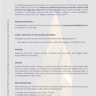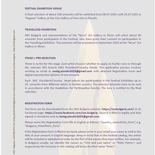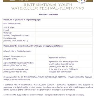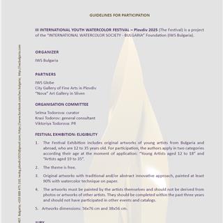 Date Published: 2025-02-01 III INTERNATIONAL YOUTH WATERCOLOR FESTIVAL Plovdiv 2025 The 3rd International Youth Watercolor Festival Plovdiv 2025 is organized by the International Watercolor Society Bulgaria (IWS Bulgaria).