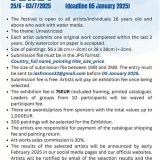 تاریخ انتشار: دوشنبه ۲۶ آذر ۱۴۰۳ فراخوان شرکت / دعوت به ارائه اثر هنری در سال 2025، Aquarelle Pyreneenne با همکاری Les Aquarellistes Ceretans اولین فستیوال آبرنگ را در شهر هنری سرِت فرانسه برگزار میکند. Aquarelle Pyreneenne 2025 فرانسه فراخوان شرکت / دعوت به ارائه اثر هنری (مهلت: 5 ژانویه 2025) لطفاً فرم مربوطه را در این لینک پر کنید: https://aquarellepyreneene.com/exposition و تصویر اثر خود را به این ایمیل ارسال کنید: iasfrance33@gmail.com هنرمندان و دوستان عزیز، این چهارمین باری است که Aquarelle Pyreneenne یک فستیوال بزرگ آبرنگ برگزار میکند. ما در سال 2025 خوشحالیم که با همکاری Les Aquarellistes Ceretans اولین فستیوال آبرنگ در Ceret، فرانسه را برگزار میکنیم. این شهر بهعنوان جواهر کاتالونیای فرانسه و شهر هنر با مشارکت افسانه هنر، پیکاسو شناخته میشود. ما صمیمانه از شما و دوستان هنرمندتان دعوت میکنیم آثار خود را برای این فستیوال ارسال کنید. جزئیات فراخوان در زیر آمده است: فراخوان شرکت / دعوت به ارائه اثر هنری مهلت: 5 ژانویه 2025 شرایط شرکت: این فستیوال برای تمامی هنرمندان و افراد بالای 16 سال که با تکنیکهای آبرنگ کار میکنند، آزاد است. موضوع: آزاد شرایط اثر: هر هنرمند میتواند یک اثر اورجینال که در دو سال گذشته خلق شده باشد، ارسال کند. تنها آثار آبرنگ روی کاغذ پذیرفته میشوند. ابعاد آثار: 56 × 38 سانتیمتر (+-2 سانتیمتر) یا 28 × 38 سانتیمتر (+-2 سانتیمتر). فرمت ارسال: فایل JPG با مشخصات زیر: کشور_نام کامل_عنوان اثر_اندازه_قیمت اندازه فایل باید بین 1MB تا 2MB باشد. ارسال آثار به ایمیل: iasfrance33@gmail.com مهلت ارسال: قبل از 5 ژانویه 2025. هزینه ارسال: رایگان هزینه شرکت در نمایشگاه پس از انتخاب آثار: 75 یورو (شامل قاببندی و کاتالوگ چاپی). هزینه ارسال کاتالوگ و بازگرداندن آثار بر عهده هنرمندان است. جوایز: جوایز و حمایتهای مالی از اسپانسرها با ارزش کل تا 1000 یورو. کمیسیون فروش آثار: 30%. تعداد آثار منتخب: 300 اثر برای نمایشگاه انتخاب خواهند شد. اعلام نتایج: نتایج هنرمندان منتخب اوایل فوریه 2025 از طریق شبکههای اجتماعی و وبسایت رسمی اعلام میشود. همچنین از طریق ایمیل به هنرمندان اطلاع داده خواهد شد. دموی هنری: برگزارکنندگان از اساتید و هنرمندانی که میتوانند تکنیکهای منحصر به فرد خود را به نمایش بگذارند، دعوت میکنند تا دموهای خود را ارائه دهند. برای هماهنگی بیشتر، با ما تماس بگیرید. سؤالات: در صورت هرگونه پرسش، لطفاً با ما از طریق ایمیل iasfrance33@gmail.com در ارتباط باشید. برای اطلاعات بیشتر درباره فستیوال و Ceret، به وبسایت زیر مراجعه کنید: https://aquarellepyreneene.com/exposition
